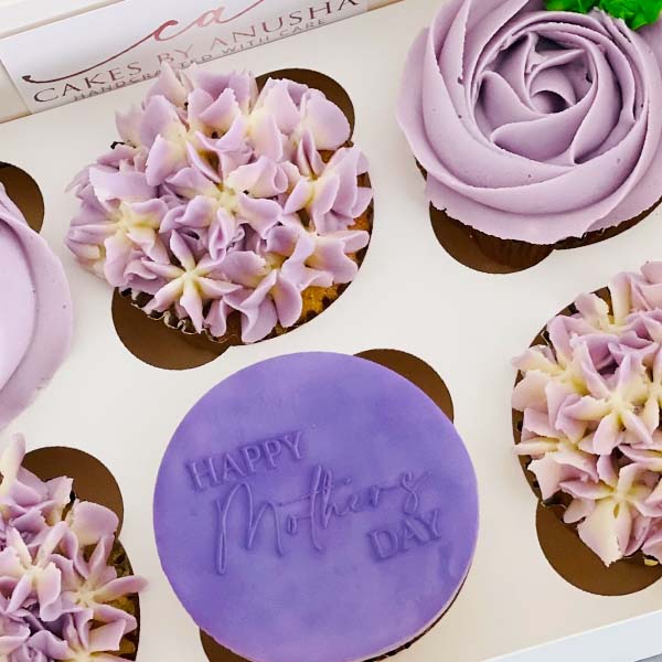 Show your love and appreciation with this elegant Mother’s Day cupcake gift box. Featuring beautifully piped purple buttercream roses and floral designs, along with a heartfelt “Happy Mother’s Day” fondant topper. A perfect sweet treat to celebrate the special women in your life!